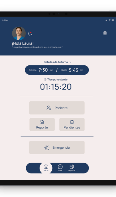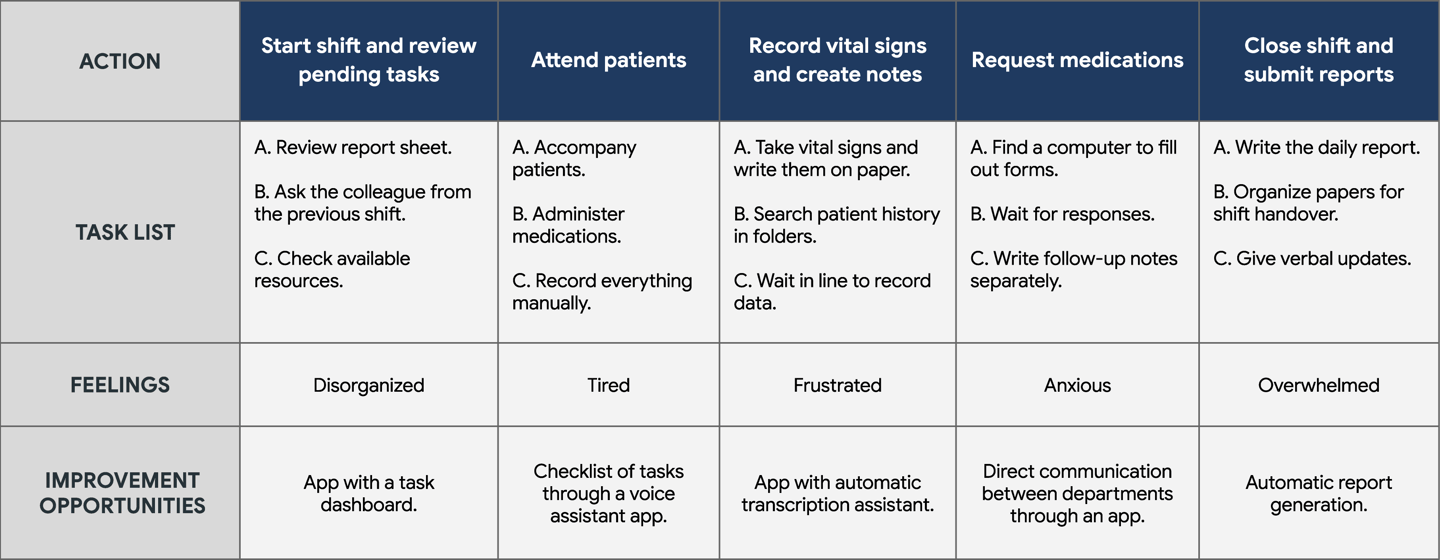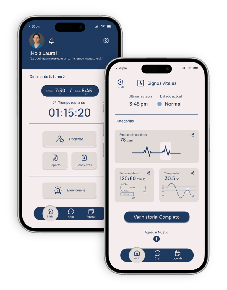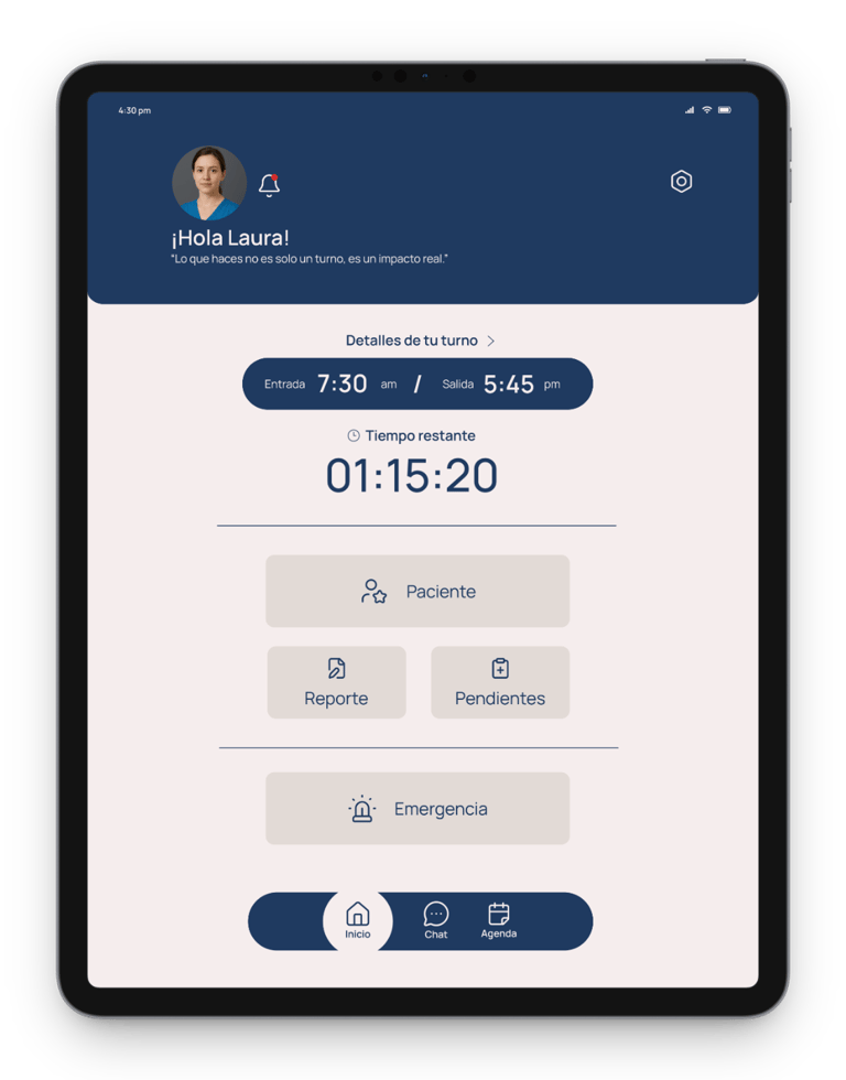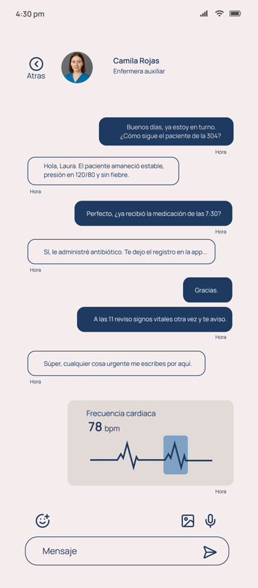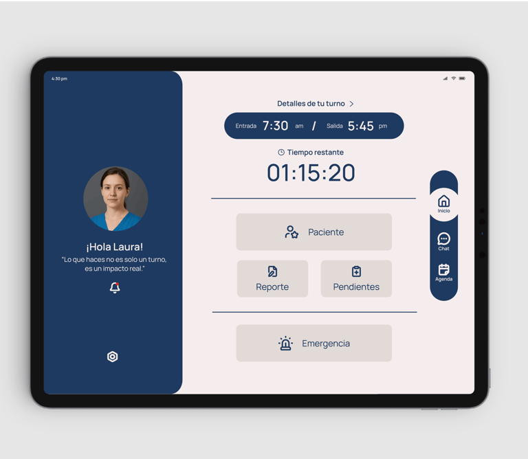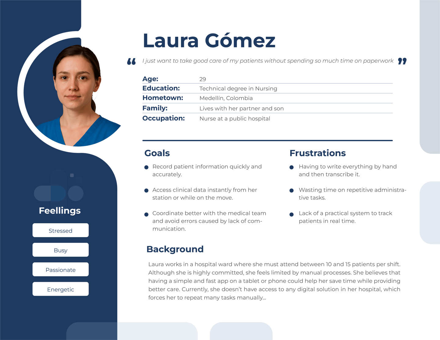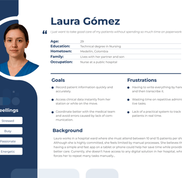 Laura works in a hospital ward where she must attend between 10 and 15 patients per shift. Although she is highly committed, she feels limited by manual processes. She believes that having a simple and fast app on a tablet or phone could help her save time while providing better care. Currently, she doesn’t have access to any digital solution in her hospital, which forces her to duplicate her efforts.