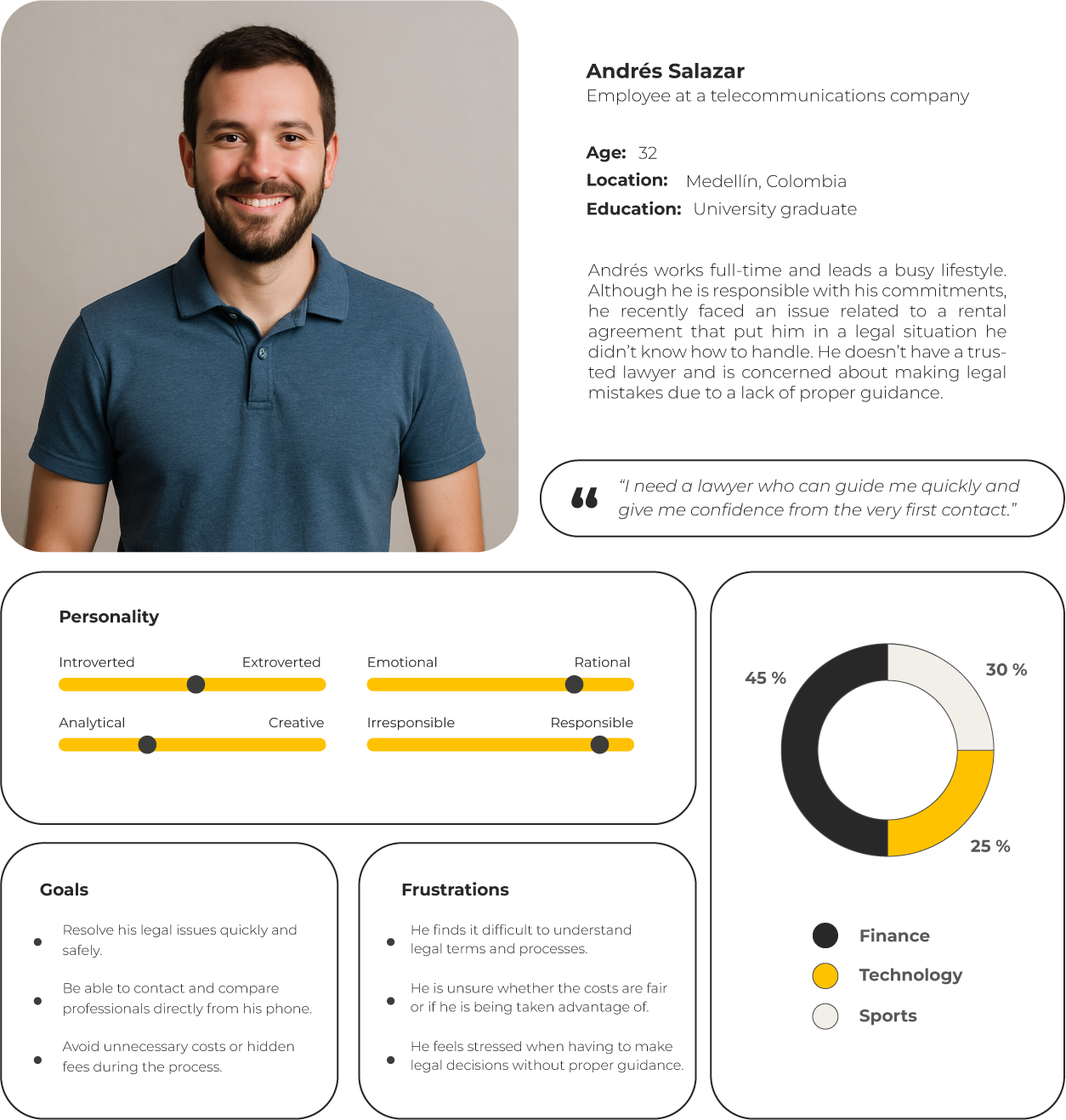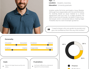 The goal was to identify real behaviors, emotions, and needs to validate the problem and guide the design of a digital solution that connects users with specialized lawyers in an immediate way.