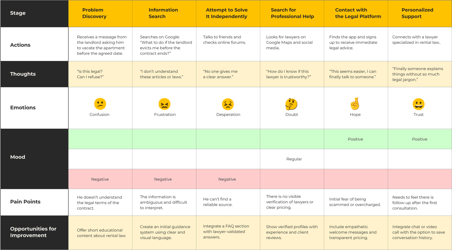 This project made it possible to gain an in-depth understanding of users’ needs, emotions, and frustrations when facing a legal situation, especially when they lack immediate guidance and prior legal knowledge. Through user research and the analysis of critical pain points, clear opportunities were identified to simplify access to legal assistance, reduce uncertainty, and build trust from the first interaction with the platform.