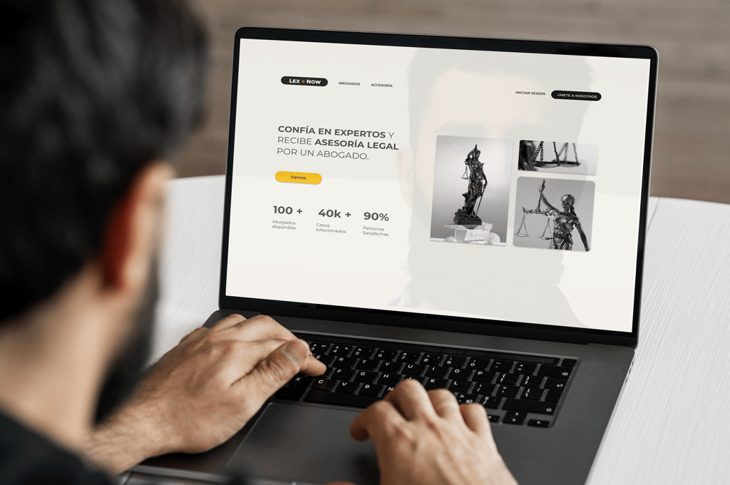 El diseño de la solución se centró en ofrecer una experiencia clara, accesible y humana, apoyada por herramientas digitales como la asesoría inmediata por chat o videollamada y la clasificación automática de casos mediante inteligencia artificial. El prototipo de alta fidelidad integró mejoras clave en jerarquía visual, accesibilidad, flujos diferenciados por tipo de usuario y transparencia en precios, logrando una interfaz sobria y profesional que responde a contextos de estrés e incertidumbre.