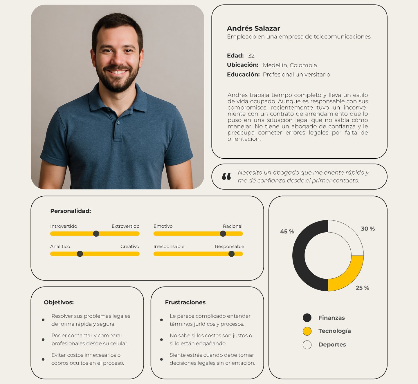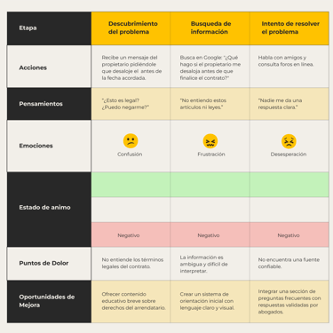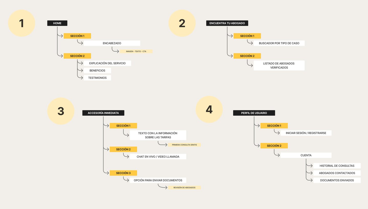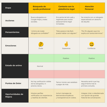 Este proyecto permitió comprender en profundidad las necesidades, emociones y frustraciones de las personas al enfrentarse a una situación legal, especialmente cuando no cuentan con orientación inmediata ni conocimientos jurídicos previos. A partir de la investigación con usuarios y el análisis de los puntos críticos, se identificaron oportunidades claras para simplificar el acceso a la asesoría legal, reducir la incertidumbre y generar confianza desde el primer contacto con la plataforma.