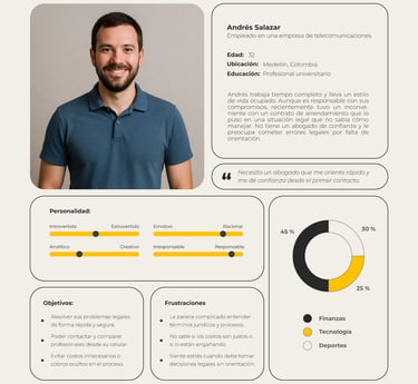 El objetivo fue identificar comportamientos, emociones y necesidades reales para validar el problema y orientar el diseño de una solución digital que conecte de manera inmediata a los usuarios con abogados especializados.