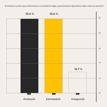 Adicional, se exploraron aspectos relacionados con la confianza, la urgencia de recibir atención legal y las emociones predominantes como el estrés, la ansiedad y la inseguridad, sentimientos que surgieron de forma recurrente entre los participantes.