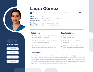Laura trabaja en una sala de hospital donde debe atender entre 10 y 15 pacientes por turno. Aunque está muy comprometida, se siente limitada por los procesos manuales. Ella cree que tener una aplicación simple y rápida en una tableta o teléfono podría ayudarla a ahorrar tiempo y brindar una mejor atención. Actualmente, no tiene acceso a ninguna solución digital en su hospital, lo que la obliga a duplicar sus esfuerzos.